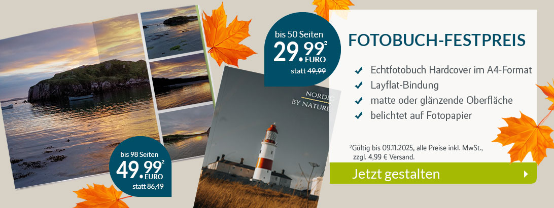 Nutzen Sie bis zum 09. November '25 die Festpreisaktion² und sparen Sie bis zu 57%² auf Ihr neues Hardcover Fotobuch. Ob Sie Ihr Fuji Echtfotobuch in Hoch- oder Querformat gestalten, bleibt Ihnen überlassen. Auf bis zu 98 Innenseiten zaubern Sie so Ihre ganz eigene Fotostory. Ein Gutscheincode ist nicht notwendig.