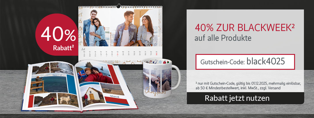 Bei Photodose erhalten Sie jetzt starke 40 % Rabatt auf alles² – ein echtes Geschenk an Sie schon vor dem Fest. Nutzen Sie die Black WEEK und gestalten Sie Fotopräsente zum besten Preis. Persönliche Fotobücher, Kalender oder andere individuelle Fotogeschenke, werden zu Weihnachten garantiert für leuchtende Augen sorgen und dabei Ihren Geldbeutel schonen. ab einem Mindestbestellwert von 50 €, gültig auf das gesamte Sortiment!